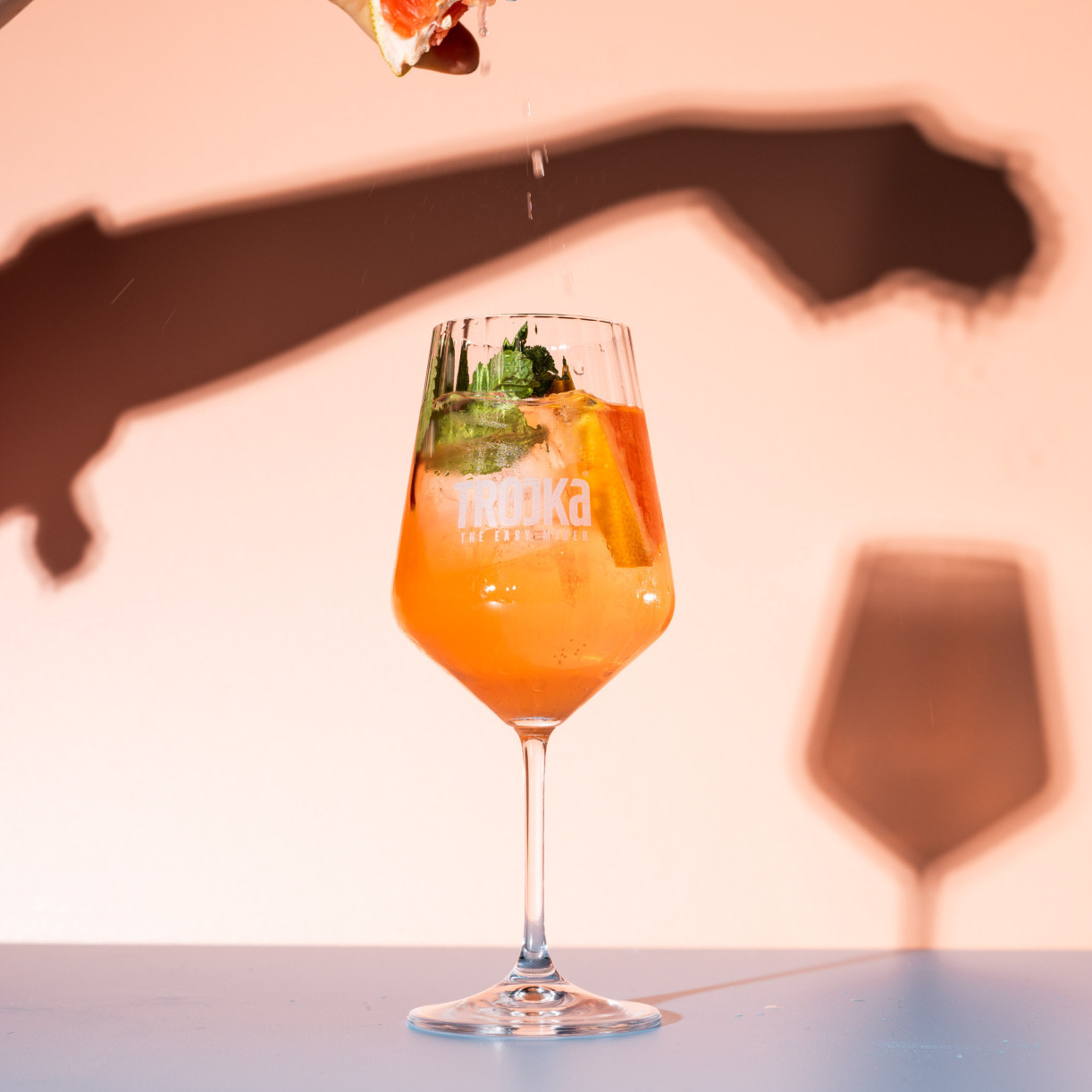 Zubereitung: Eis in ein Weinglas geben, Trojka Flamingo dazugiessen, mit Prosecco auffüllen und mit einem Schuss Mineralwasser abrunden, leicht umrühren. Mit Grapefruit oder frischer Minze dekorieren.