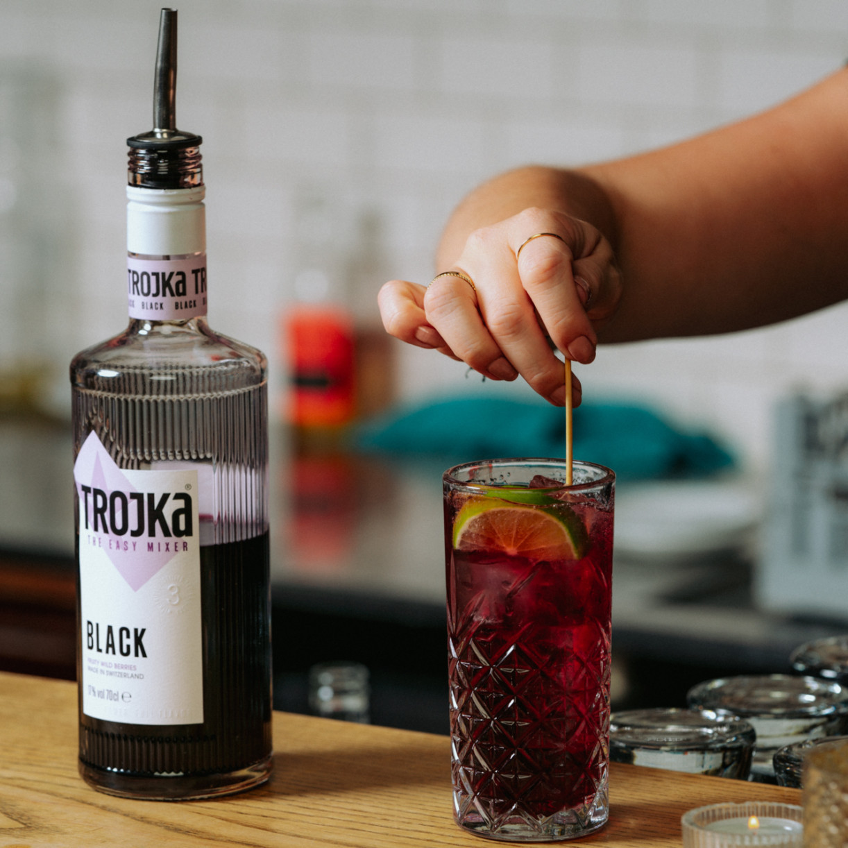 Lust auf eine neue Fizz-Variante? Dann mix den Drink doch mal mit Trojka Black, dem leckeren Waldbeerenlikör von Trojka.