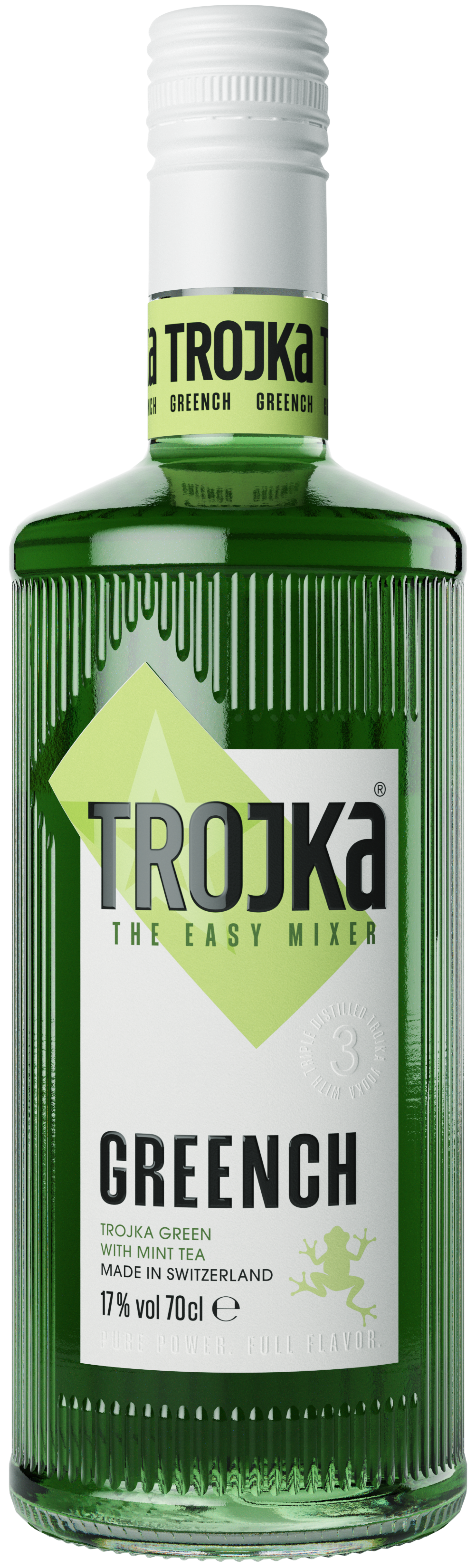 Trojka Greench folgt dem Trend des «Fröschlis». Der bekannte Carneval-Drink aus Trojka Green und Pfefferminztee war die Basis der Greench-Kreation. Denn dieser Likör schmeckt wie Trojka Green (Granatapfel, Wassermelone, Limette) mit einer Pfefferminznote.